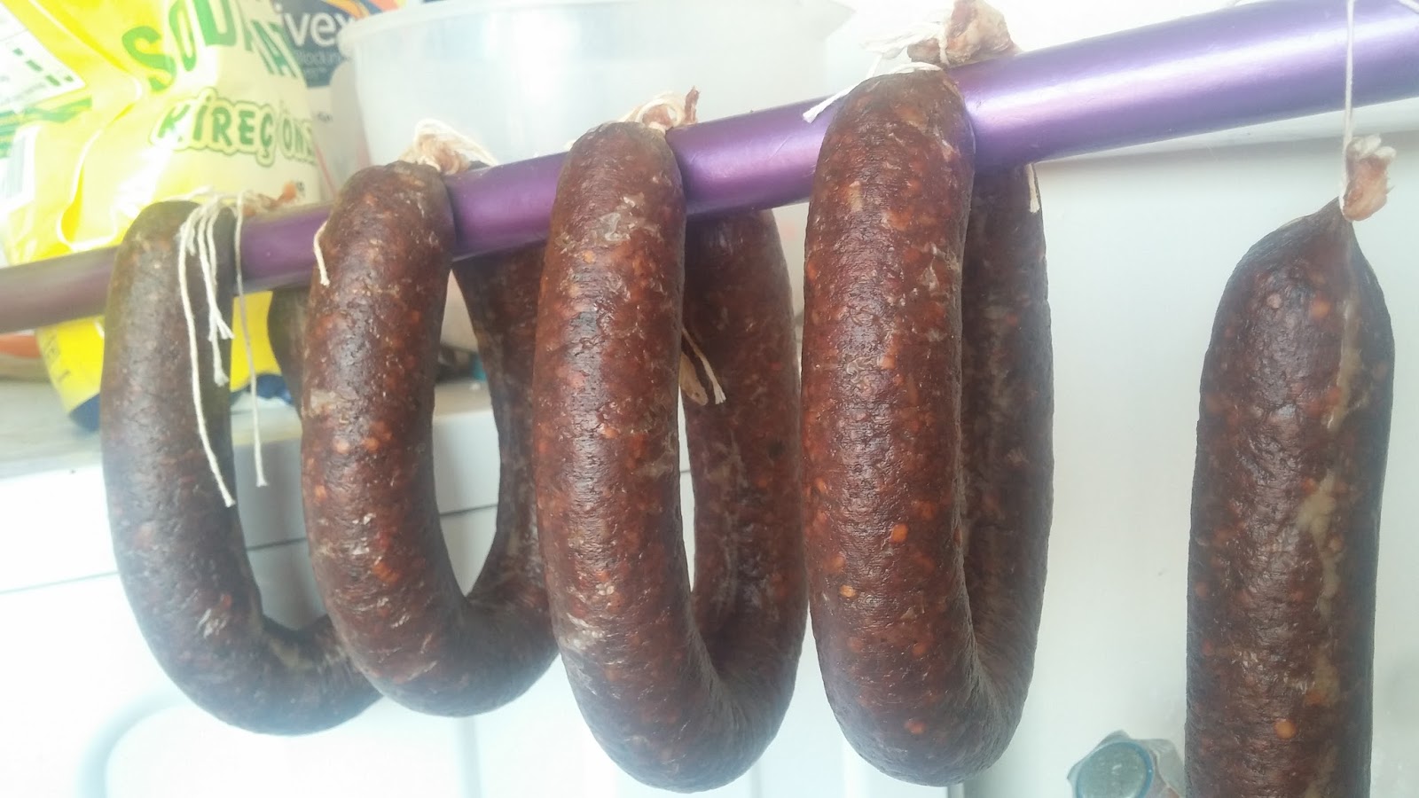 Yaptığım sucuk harcını önce buzdolabı poşetlerine koyarak buzlukta saklamayı düşündüm. İhtiyaç duydukça buzluktan azar azar çıkartıp kullanırım dedim. Ancak fermente bir sucuk elde etmenin tek yolunun sucuğu bağırsakta kurutmak olduğunu öğrenince ben de biraz zahmetli olan bu yöntemi tercih etmeye karar verdim. İyi ki de kurutarak fermente etme yöntemini seçmişim çünkü hem sucukların lezzeti muhteşem oldu, hem de kurutmadan yapılan buzluk sucukları sadece baharatlı ve sarımsaklı kıyma oluyor, yani fermente bir gıda olan sucuk olamaktan çok uzak, lezzetli bir et ürünü oluyor sadece.